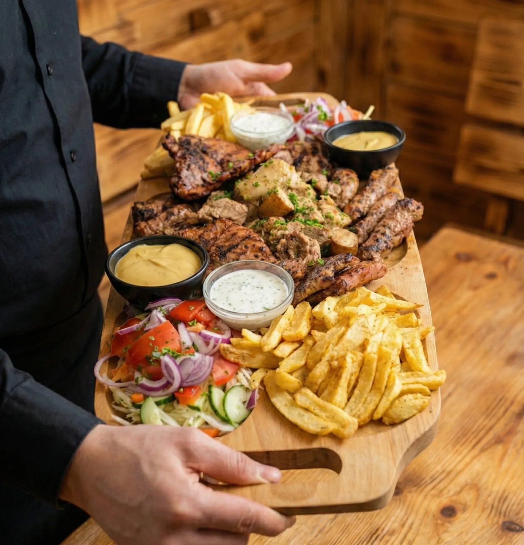Grillade mixte (bœuf, blanc de poulet, pastrami de porc, 4 mititei, frites, salade mixte).